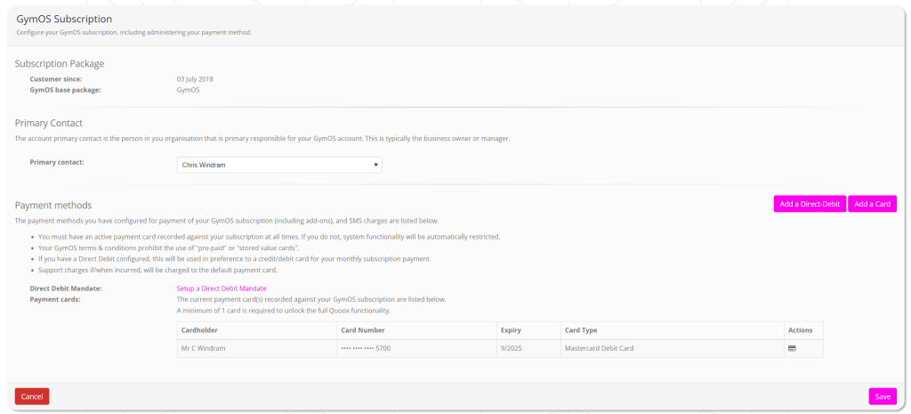 Any user with Manager rights may add or update a payment method for the Quoox GymOS subscription.