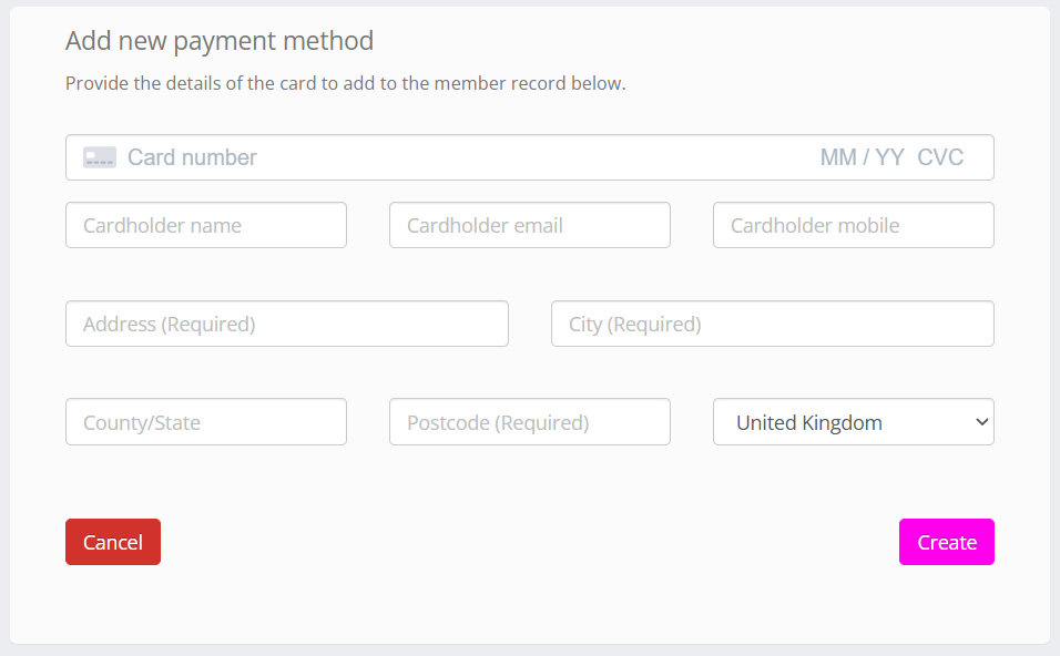 If the member has already entered address information in their membership profile, it will be pre-filled. Enter the card details accordingly, and click the Create button.