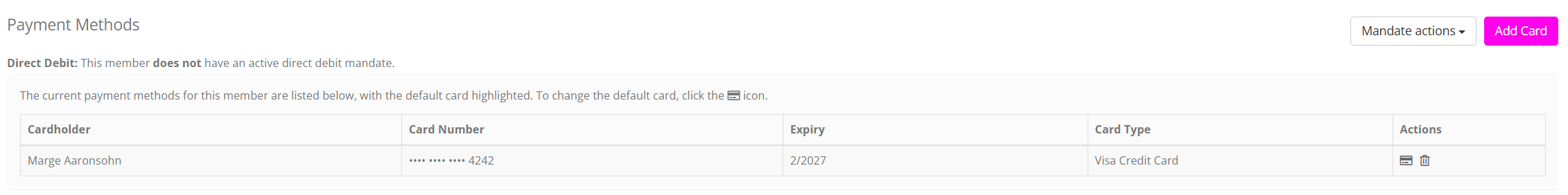 The list of current cards recorded against the member’s record may be found in the Payment Methods section of the Activities tab on the Member record.