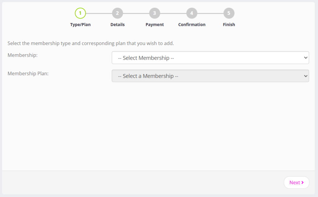 - Click the Add Membership button. This will open the Type/Plan step of the Add Membership pop-up wizard window.