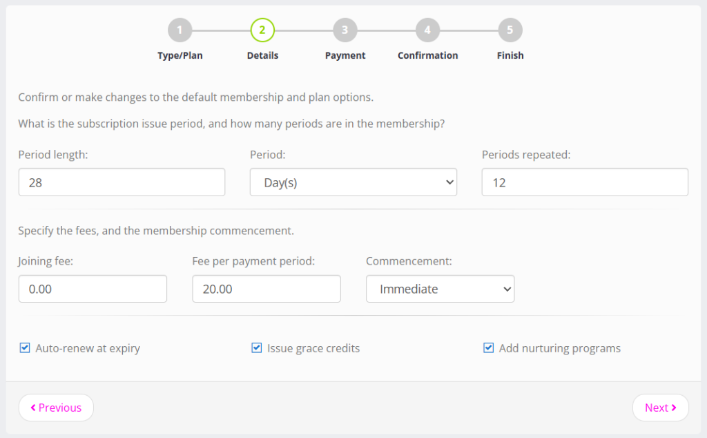 You may choose whether the membership auto-renews at expiry, and whether you wish GymOS to assign any nurture programs associated with the membership. You may also opt out of issuing grace credits, but we generally recommend that you always issue grace credits.