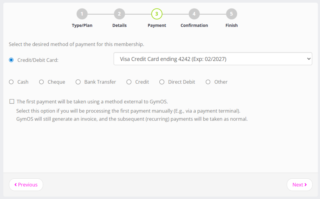 If you take the first payment by another means, such as an in-house credit card terminal, check the First payment will be taken using a method external to GymOS. This instructs GymOS not to charge for the first payment. GymOS will still generate an invoice (receipt) that is sent to the member, and all subsequent recurring payments will be taken as per normal.