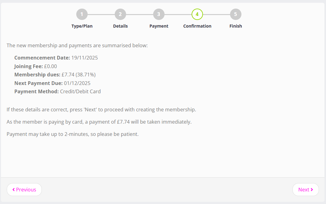 - Click the Next button. The wizard will initiate payment as required. If successful, the membership will be configured, and the wizard will progress to the Finish step.