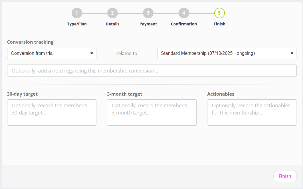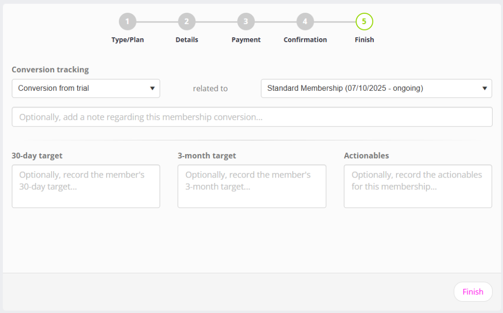 - Within the final step of adding a membership, you may indicate if the membership was a conversion from a previous plus add goals and aims.