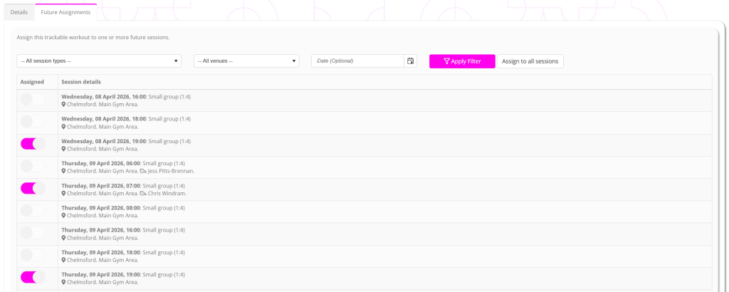 To assign the workout to all sessions matching the current filter, click the Assign to all sessions button.