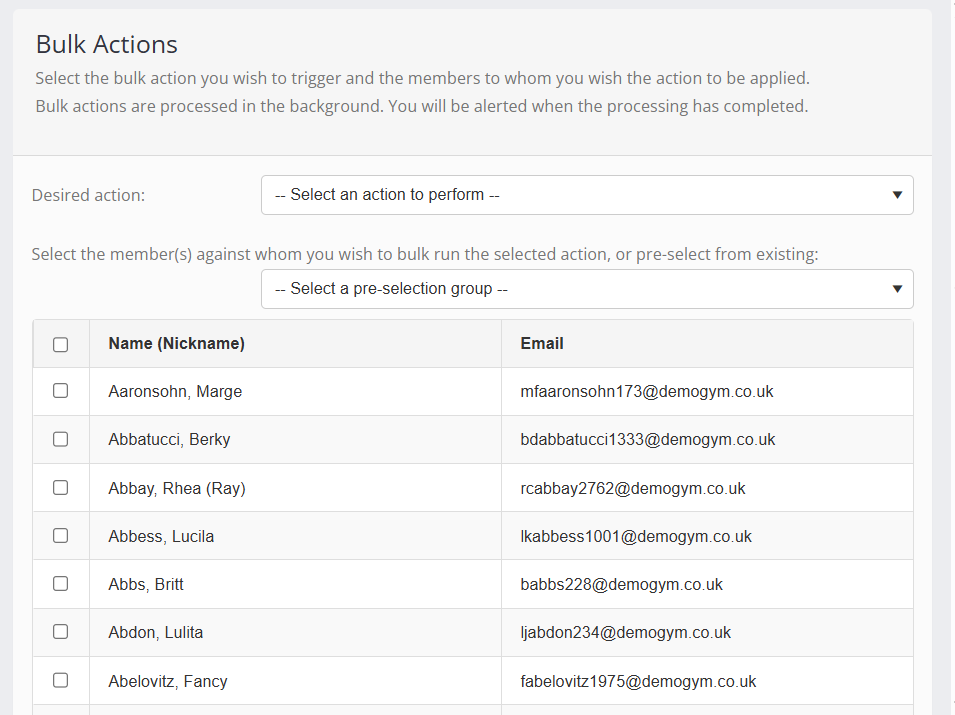 Several bulk actions can be performed against members or groups of members. The bulk actions pop-up window is accessed by clicking the Bulk Actions button located at the top of the member listing screen.