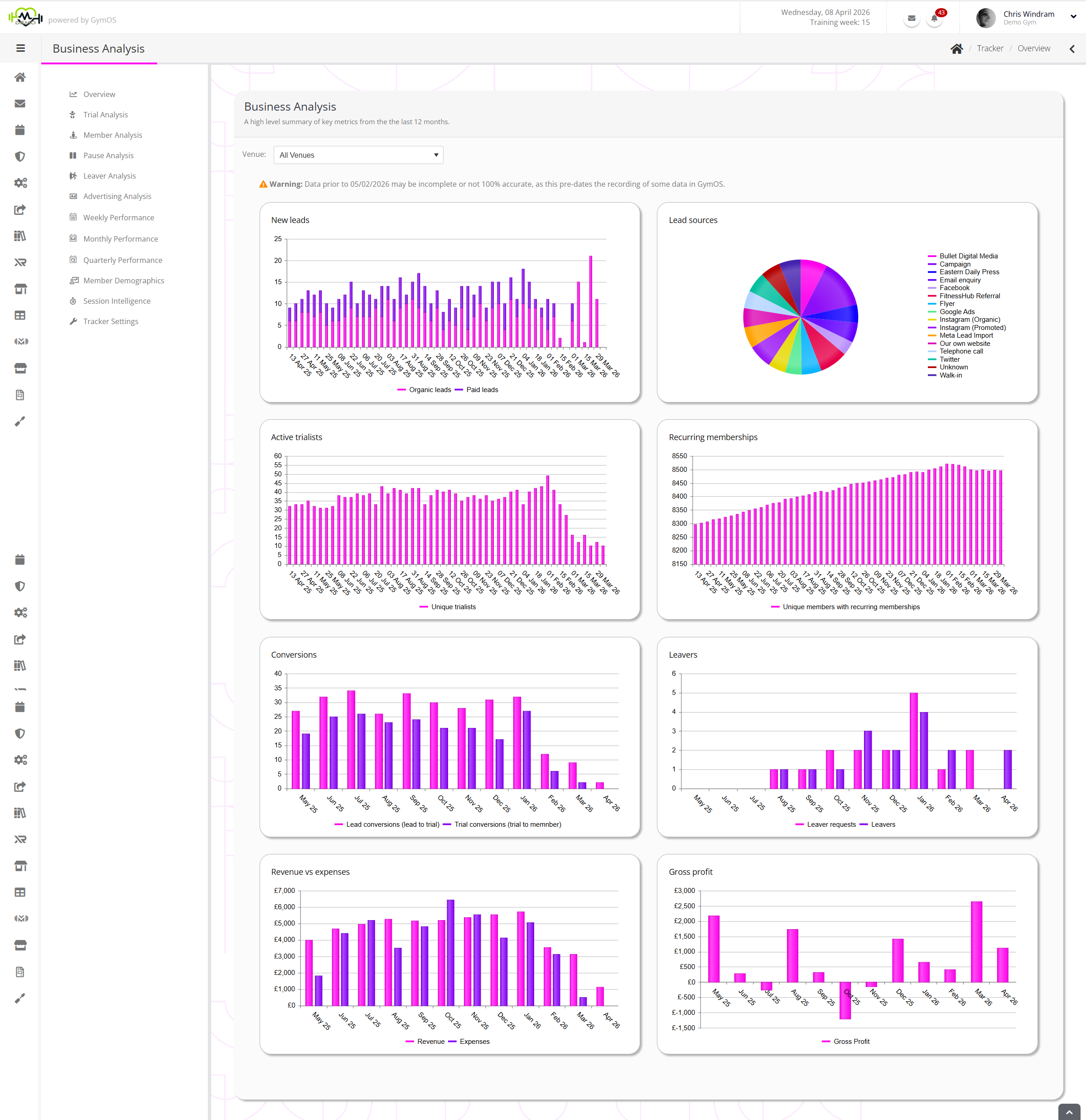 Before you can access the Business Analysis functions, you must configure your tracker settings. Once this has been completed and the initial data population has finished, the GymOS business analysis functions will become available.