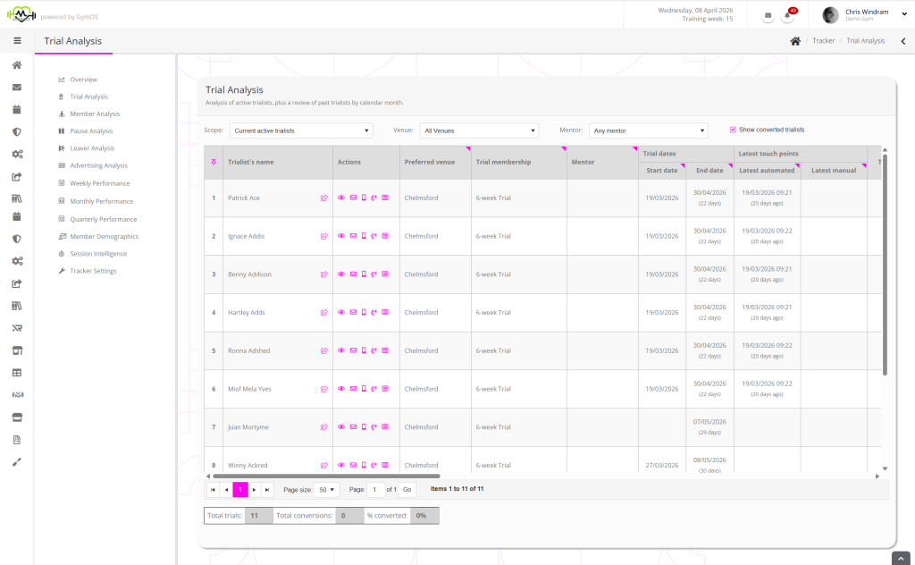 Clicking a trialist’s name opens their member record. Clicking on the icon alongside their name opens the member record in a new browser tab.