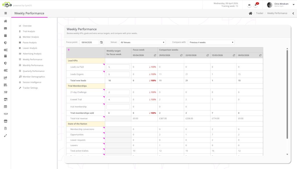 The Weekly performance function is found within the Business Analysis section of Reporting from the main navigational menu.