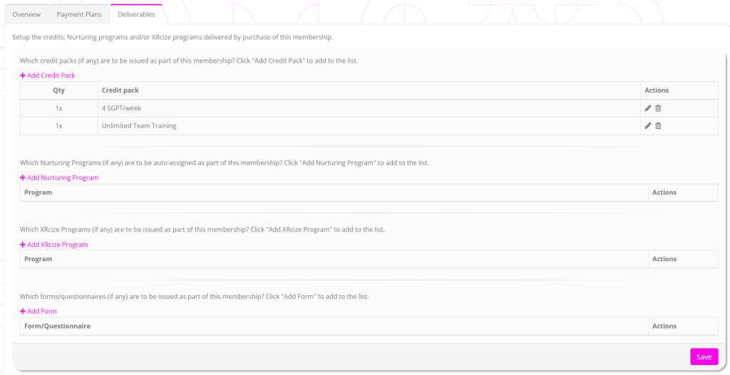 By way of example, you might create a credit pack that comprises “4x SGPT sessions”. For your “1 per week” membership, you’d assign 1x credit pack every 28 days. For your “2 per week” membership, you’d assign 2x credit packs every 28 days. For your “3 per week” membership, you’d assign 3x credit packs every 28 days. Thus, you only need one credit pack as opposed to three.