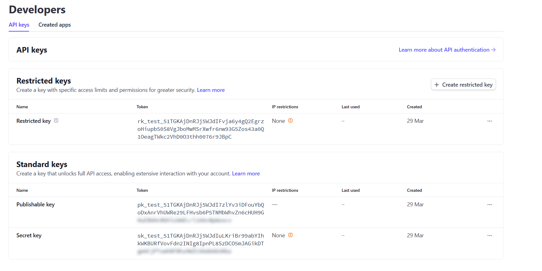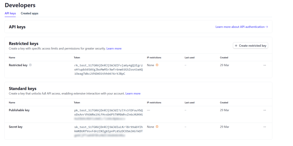 - From within the Standard Keys section, locate the tokens for the publishable key and secret key.