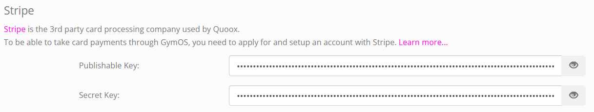 In turn, paste your publishable and secret Stripe keys into GymOS. These will begin pk_live_ and sk_live_ respectively. If they start pk_test_ or sk_test_, then you have not yet activated your Stripe account and the test keys will not work in the live production environment.