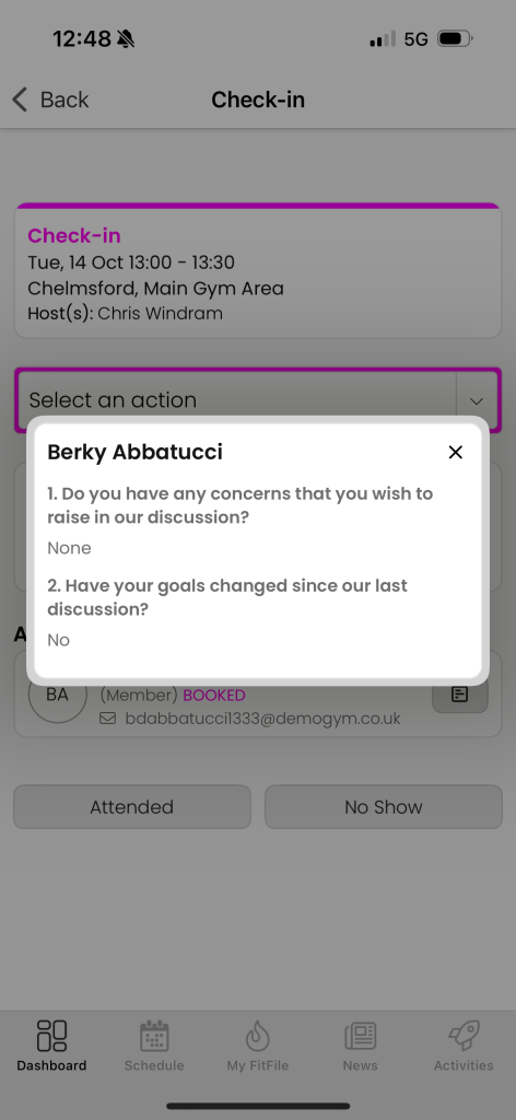 - Answer Questions – any optional or mandatory booking questions configured in GymOS display here.