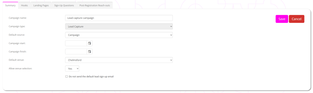 You should only provide these if you wish to prevent registrations outside a given date range. - Select the default venue that you wish to associate leads registering against this campaign with.