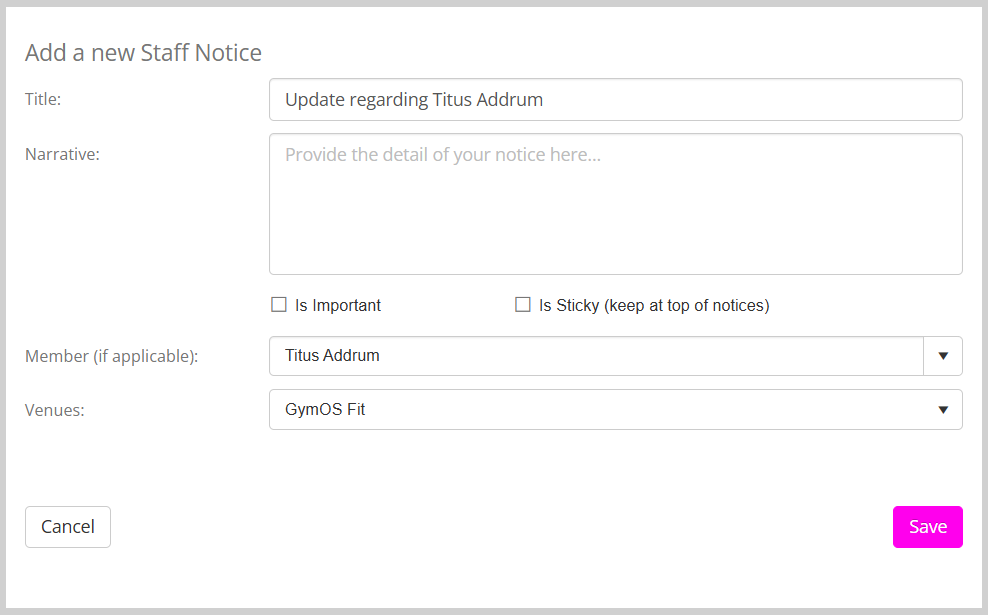 - Complete the information requested in the pop-up staff notice form. The Is Important and Is Sticky options may be used to give additional prominence to the notice.