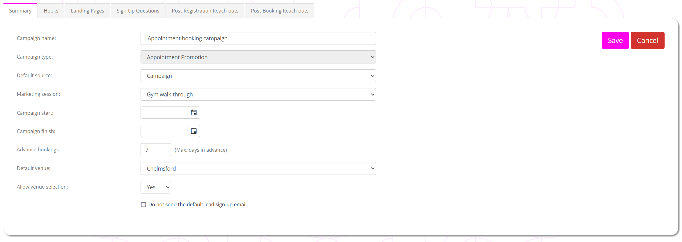 An appointment promotion campaign is one of the built-in GymOS campaign types. The purpose of this campaign type is to provide a simple route for an individual to register their interest and to book a marketing session in the GymOS system.