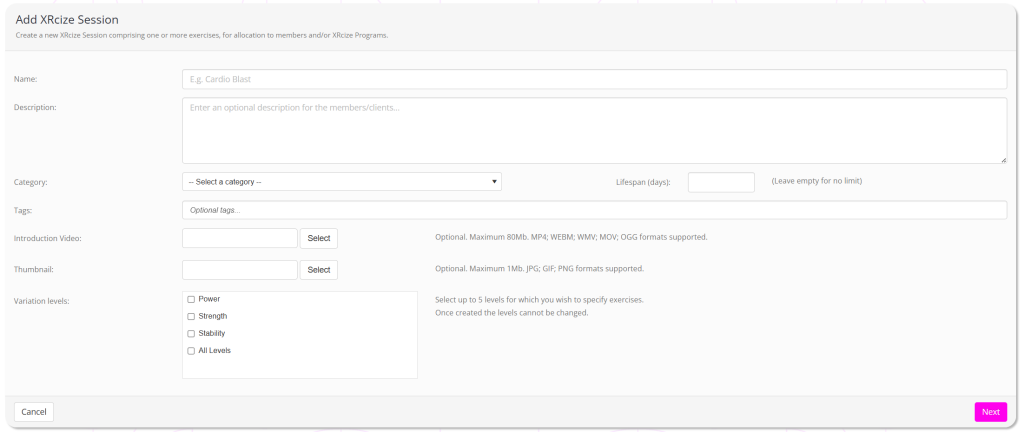 - Introduction video – Optional. Upload an introduction video (Max. 80Mb) that provides the member with an introduction to the workout session.