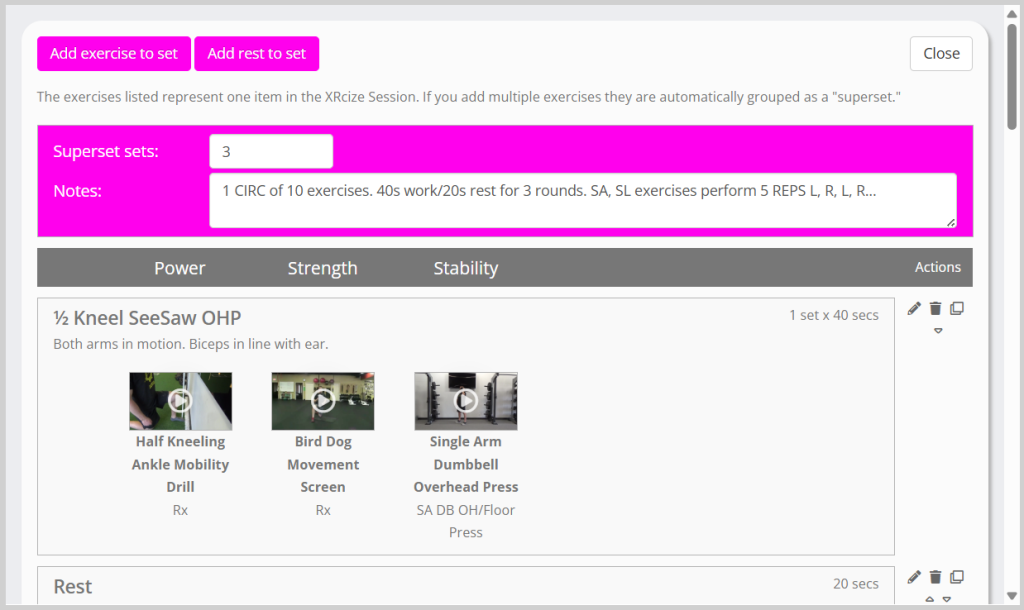 In GymOS, creating a superset; tri-set; or giant set is easy. The popup exercise/set builder represents one item in the session. So, if you add multiple exercises/rests into the same popup GymOS automatically creates a superset from this.