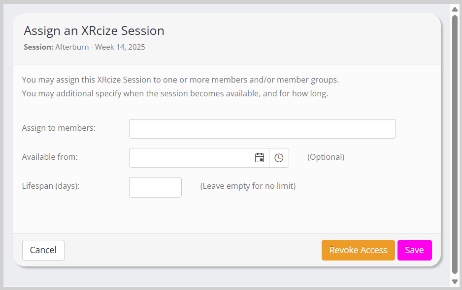 Clicking Save will assign the session. Clicking Revoke Access will revoke access from all members to whom the session is assigned.