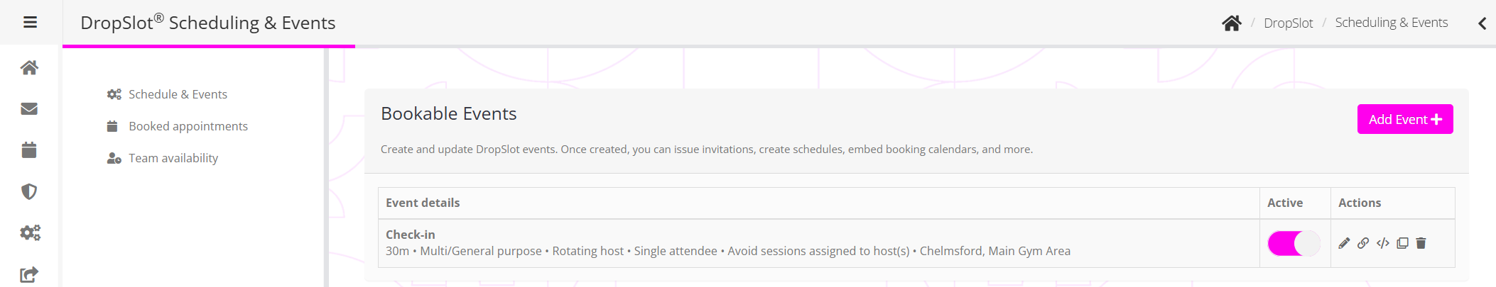 Note: Deactivating an event pauses all booking activity and schedules for that event type.