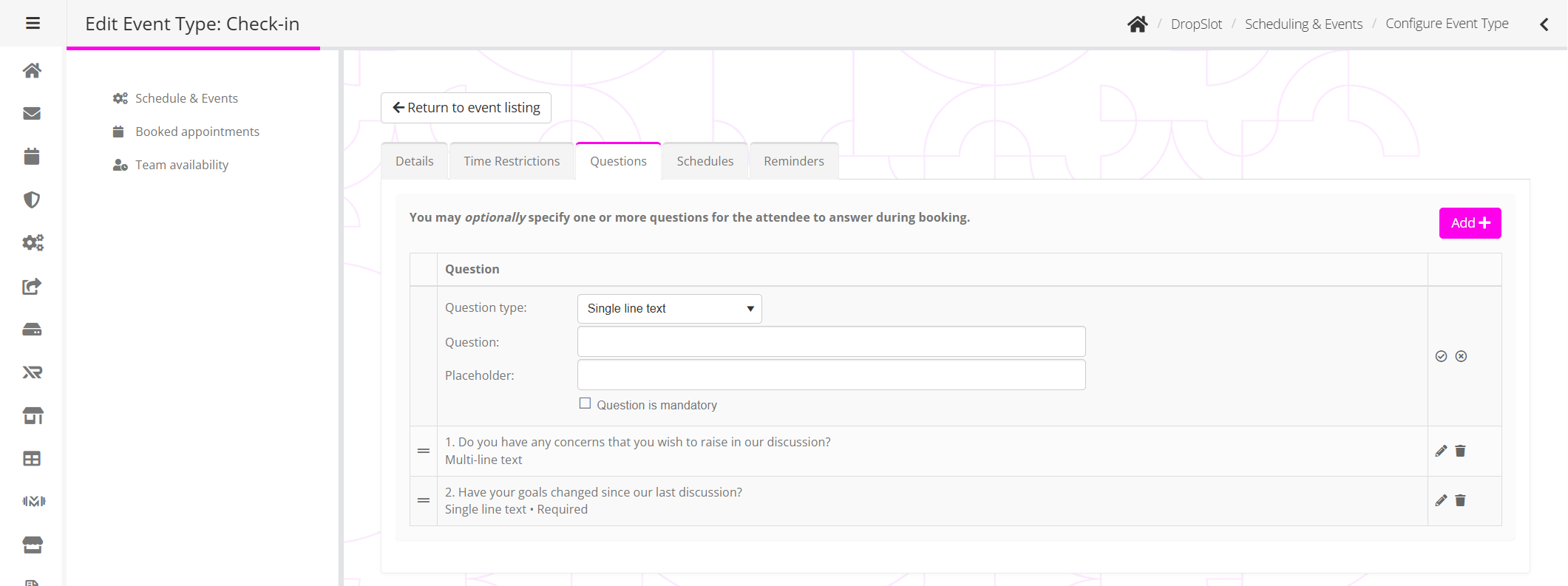 Optionally add questions to your booking process (single- or multi-line) and make them mandatory as needed. Use placeholder text to guide responses.