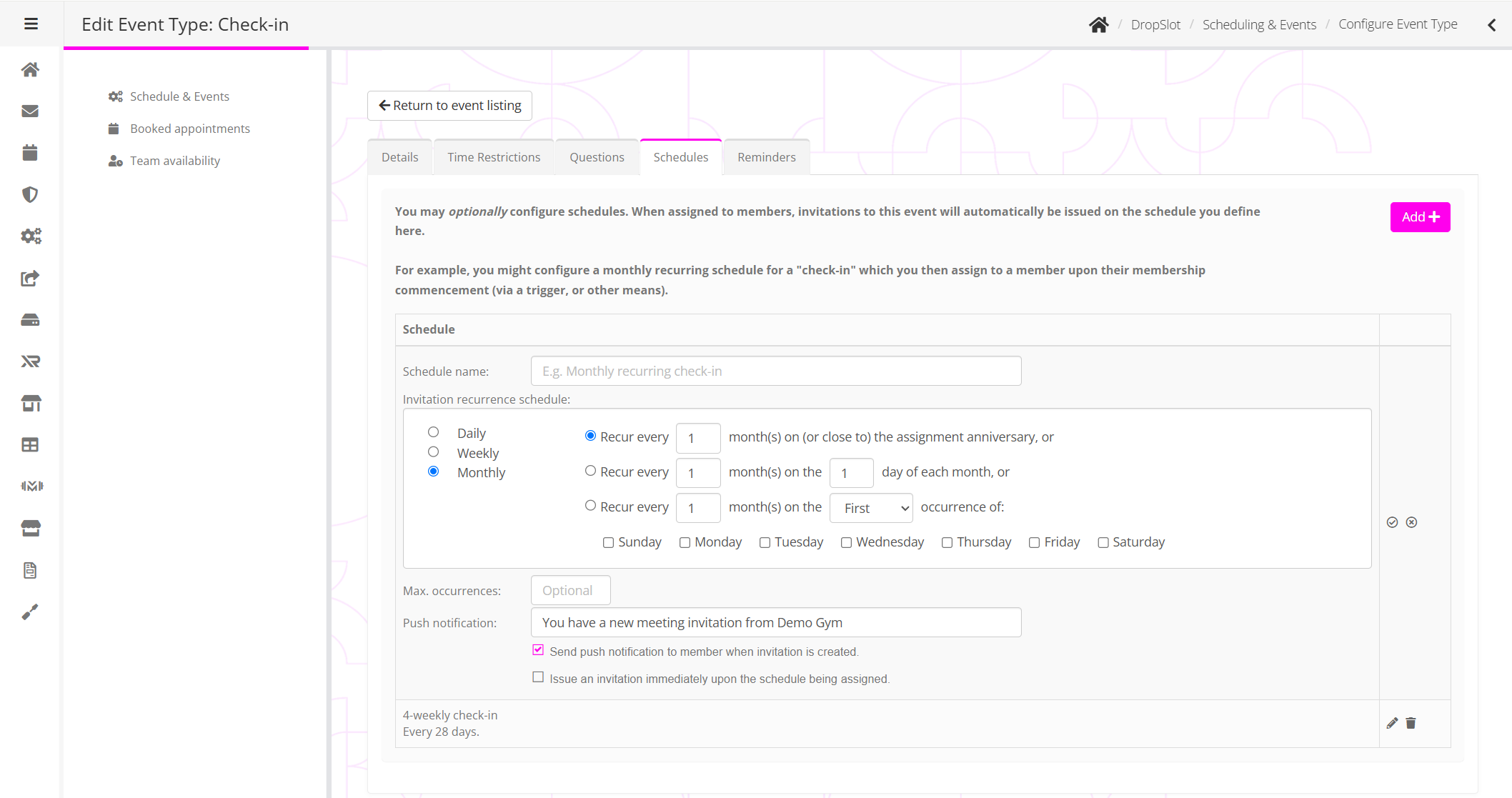 Event-type schedules automate recurring invitations for members and are an enormous time saver.