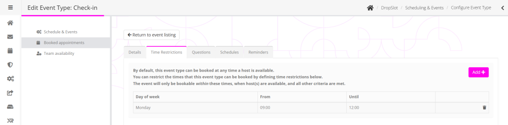 Refine when the event is offered – e.g. Mondays between 9 am – 12 pm – regardless of overall host availability.