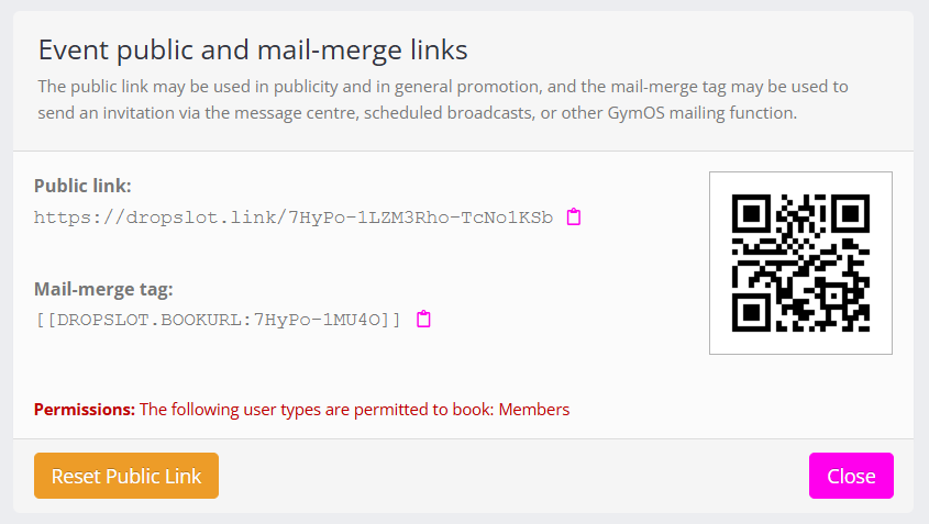 Each event has a public booking URL and a QR code that can be shared via email, on posters, or online.