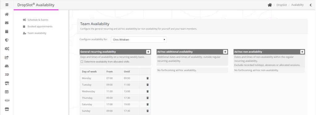 Before you start creating consultations or issuing invitations, first configure your team availability. This defines the availability of each staff member for a DropSlot consultation.