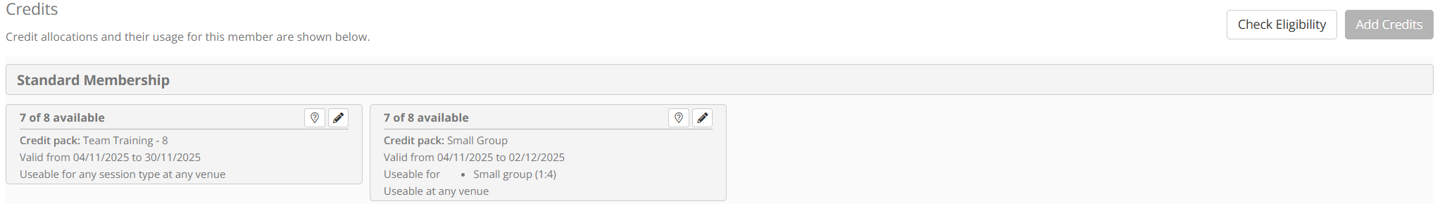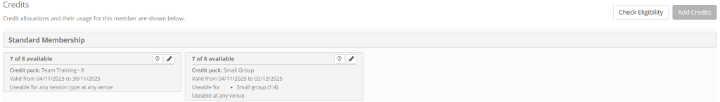 Once a credit pack has been allocated to a member, it may be subsequently edited. For example, you might want to extend the validity period or revoke the remaining credits.