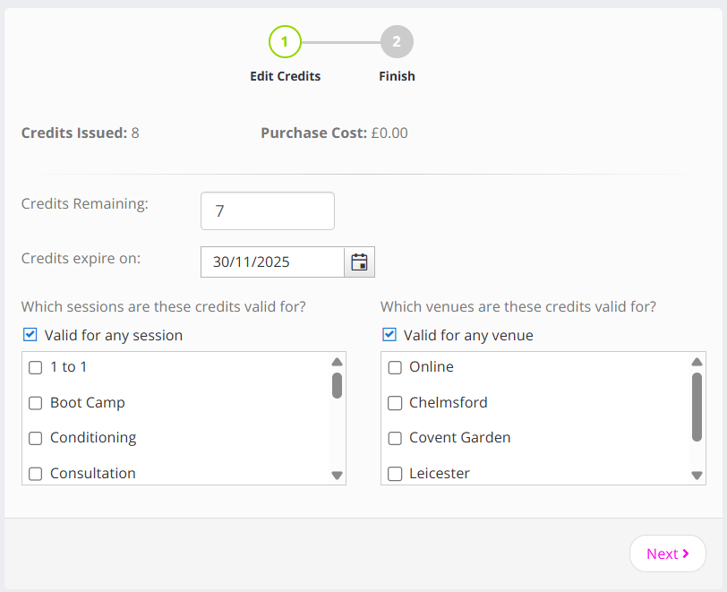 - Make amendments as you want to the number of credits remaining, the expiry date, and the session and/or venue validity.