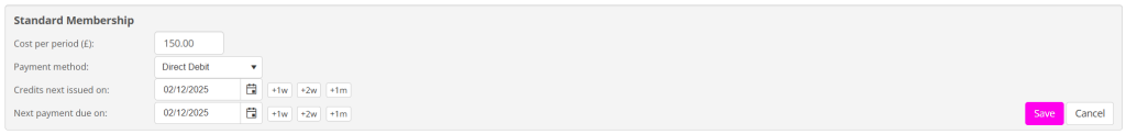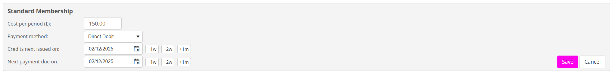 Changing the cost per period does not implement any pro rata adjustment. The amount charged at the next payment date is the new amount you have specified. - Regardless of the selected payment method, the presence of an active Direct Debit mandate on the member’s record will always take precedence. This is by design.