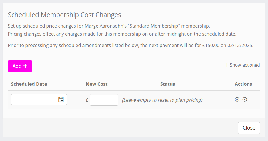 Note: We do not recommend setting the date to be a date upon which the member is due to be charged, as there is no guarantee over the timing or the order in which the events will occur. Schedule the adjustment to be at least 1 day before or after the payment date. - Enter the new cost you wish to apply. If you wish the membership to revert to the price set on the originating membership plan, leave the box empty.