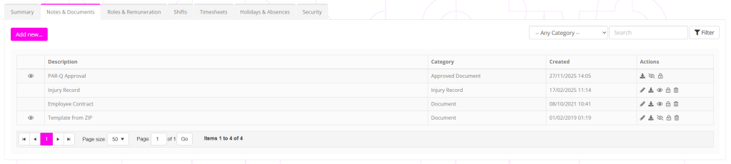 The Employee Notes & Documents tab is very similar to that of the member record, with some context-relevant differences. In fact, the employee record pulls across notes & documents from the employee’s corresponding member record.