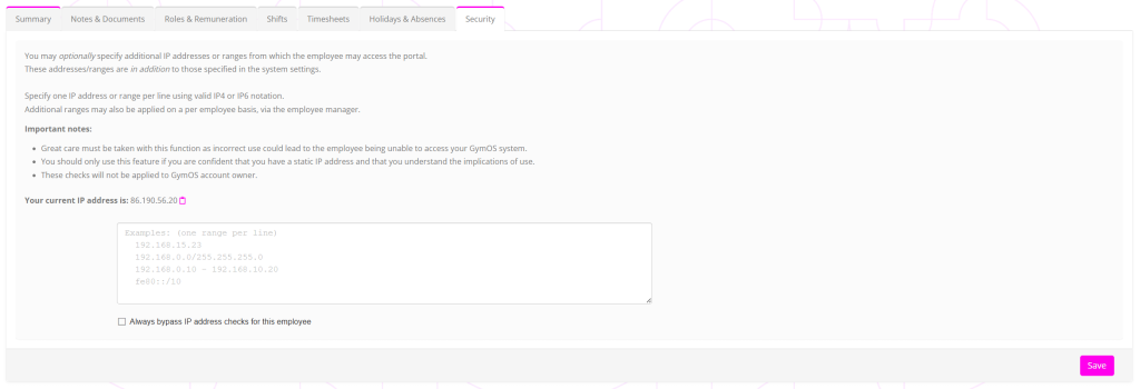 Where IP addresses or ranges are provided, the check is that the public IP address presented by the employee’s device to the GymOS system matches at least one entry in the permitted list and/or the system-wide Security settings.