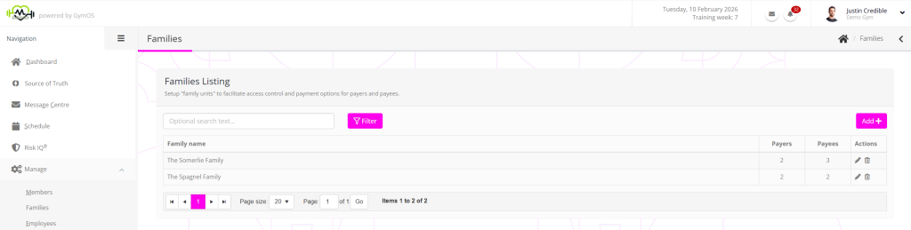 Whilst it might not technically be the case, these funding groups are referred to as “families” within GymOS. They are set up and administered via the Families option on the main menu, within the Manage section.