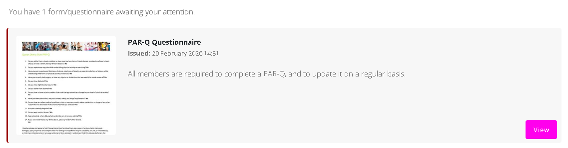 The Forms & Questionnaires section allows members to view and complete any forms assigned to them by the gym.