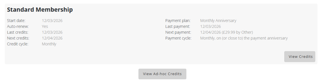 When this button is clicked, the member will be shown any credits issued as part of their membership, including: