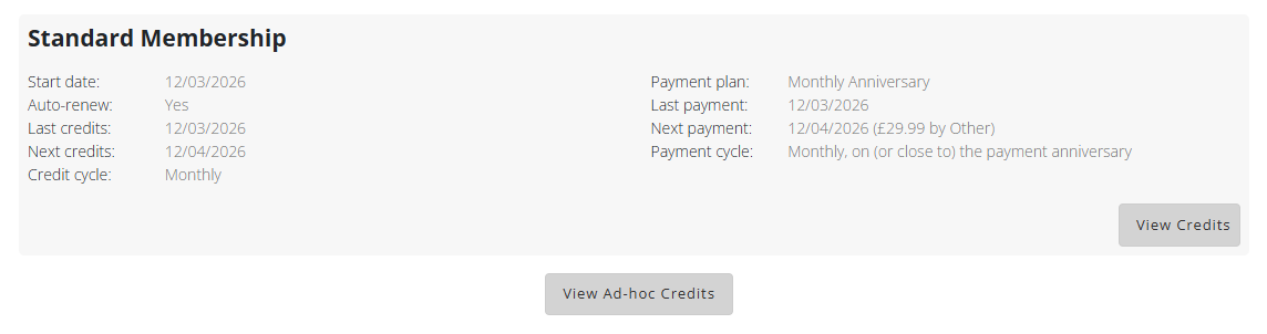 Members will also see a View Adhoc Credits button on the Memberships / Credits screen.