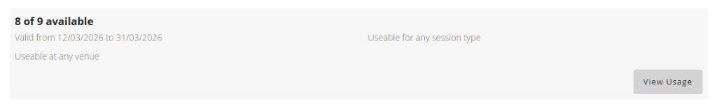 Each credit pack will also include a View Usage button. Selecting this will show the sessions that have been booked using those credits.