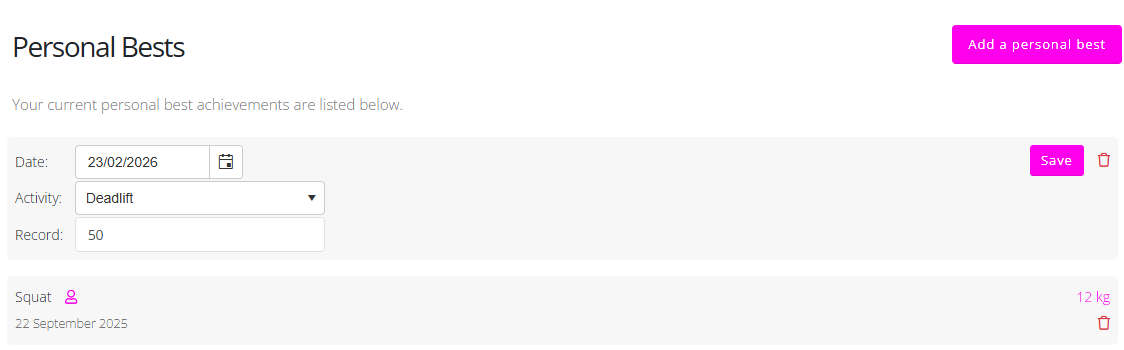 On the Personal Bests screen, the member will see a list of any personal bests they have previously recorded.