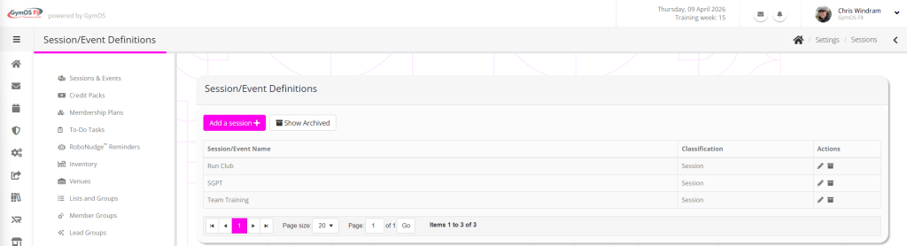 The Sessions & Events section within Settings on the main navigational menu is where you configure your session/event types, and schedule recurring sessions.