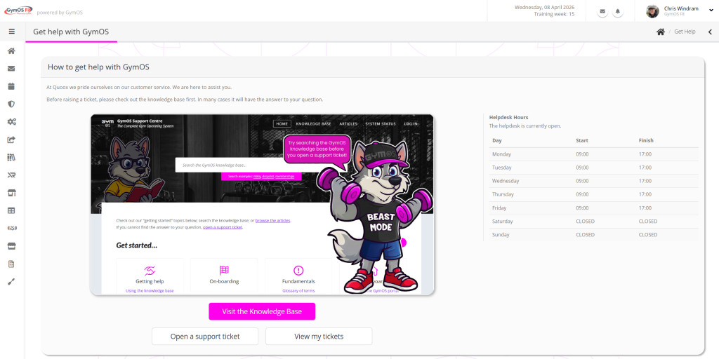The GymOS help desk is normally open 9am to 5pm UK time, Monday to Friday, excluding bank holidays.