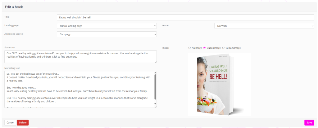 • Landing page – the campaign landing page to which the hook should direct people.