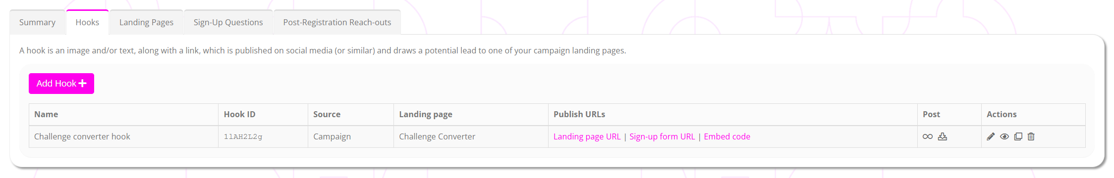 Hooks form an optional (but recommended) part of a GymOS campaign. A given campaign may have an unlimited number of hooks, and these are administered via the Hooks tab on the campaign record.