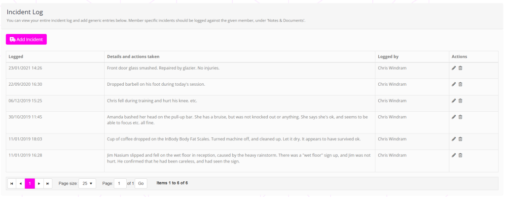 The Incident Log is accessed from the Manage section of the main navigation menu. The incident log is the central repository for recording incidents that occur in your facility. The central log consolidates incidents logged against individual members.