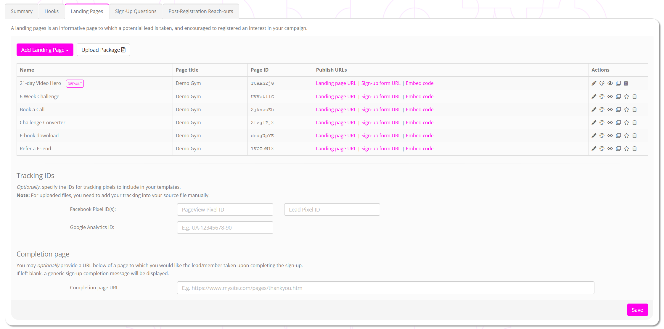 You may optionally provide Facebook and/or Google Analytics IDs, which GymOS will automatically embed in your landing page(s) and registration form(s).