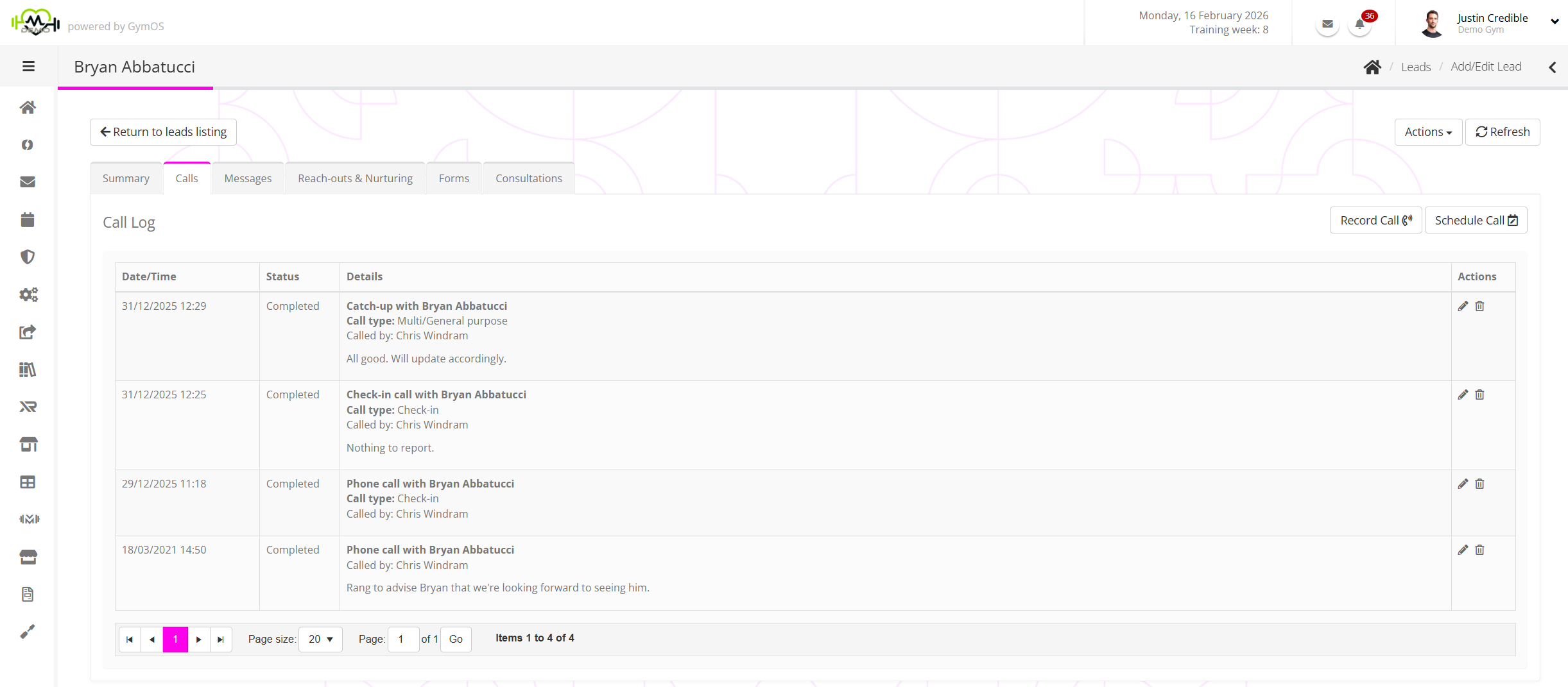 The Calls tab is the Call Log for the selected lead. On this page, you can schedule future calls with a lead or record the details and outcome of completed calls.
