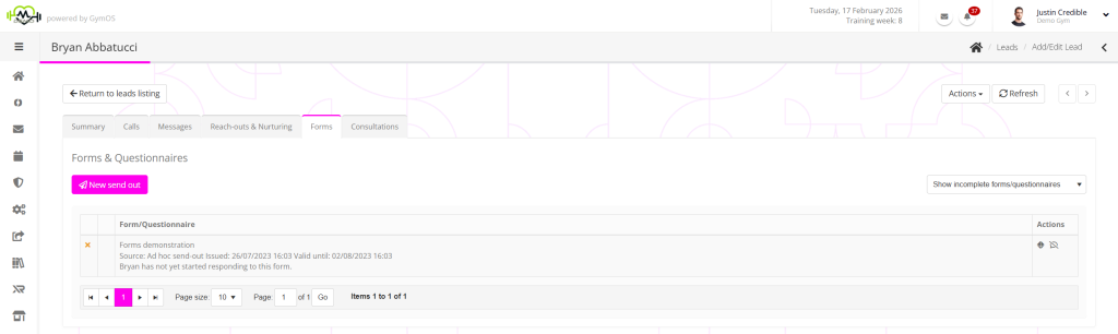 There are many ways within the GymOS system to send a form or questionnaire to a lead for completion. One of those methods is the New send out button on the Forms tab of the lead record.