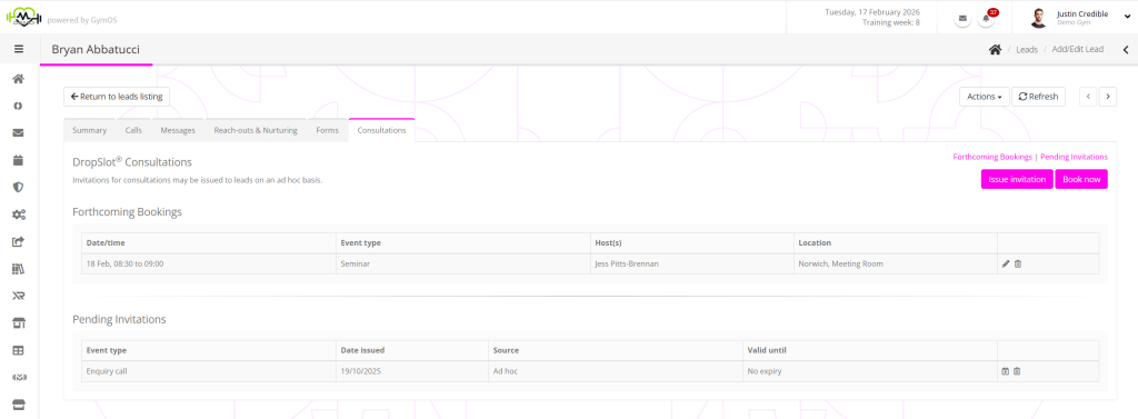 The Consultations tab on the lead record is where you can view a lead’s forthcoming DropSlot bookings, and issue or cancel an invitation.
